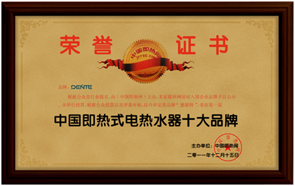 近日,德恩特品牌又被“中國即熱網”(www.jrrsq.com)評為“中國即熱式電熱水器十大品牌”,并榮獲第二名。