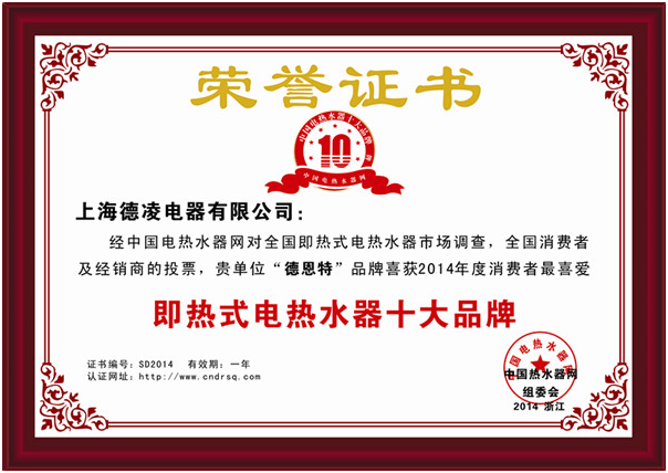 上海德凌電器有限公司經中國電熱水器網對全國即熱式電熱水器市場調查,全國消費者及經銷商投票,“德恩特”品牌喜獲“2014年度消費者最喜愛即熱式電熱水器十大品牌”并連續4年獲得排名第一。